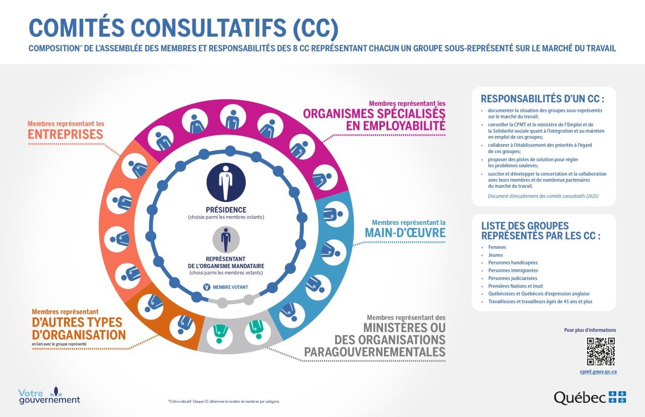 Les comités consultatifs ont pour mandat de conseiller la CPMT et le ministère de l’Emploi et de la Solidarité sociale (MESS), à la demande de ceux-ci ou de leur propre initiative, sur des questions relatives à l’intégration et au maintien en emploi des groupes sous-représentés sur le marché du travail.